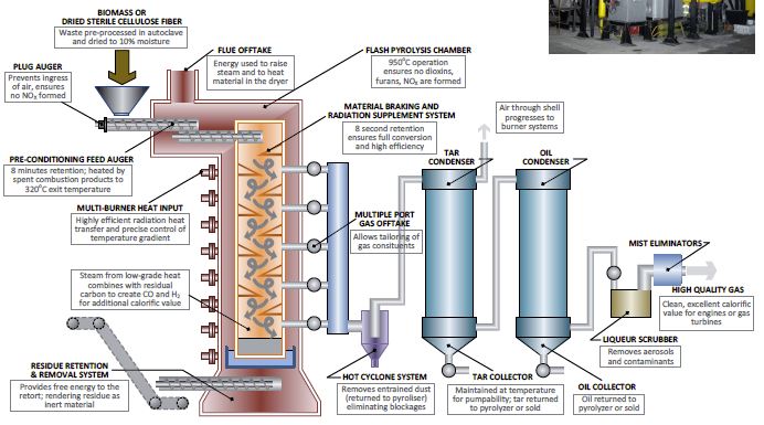 Biomass pyrolysis can thus improve the efficiency of large-scale biomass power facilities such as those for forest industry residues and specialized facilities such as black liquor recovery boilers of the pulp and paper industry, both major sources of biomass power. Like natural gas, syngas can also be burned in gas turbines, a more efficient electrical generation technology than steam boilers to which solid biomass and fossil fuels are limited. The PTE pyrolysis process has successfully operated gas engines utilizing many different biomasses as the feed source.