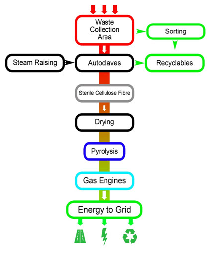 Autoclaves: used to sterilise waste, remove pathogens and break down the waste into a homogeneous, smaller size feedstock for pyrolysis. It sterilises the recyclables, rendering them of a saleable purity. Converts the carbonaceous matter to cellulose fibre suitable for transfer to the Pyrolisers;